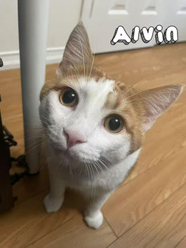 Alvin 初到新環境時比較謹慎,需要幾天時間慢慢適應。吃飯時只要有一點動靜就會停下來觀察。等熟悉後,他立刻變身「乾飯王」。最喜歡窩在視野最佳的位置,默默觀察全家的動態;偶爾興致一來,會追逐小球玩得不亦樂乎。雖然能與其他貓狗和平共處,但更享受一貓的安靜時光。新主人若能協助他減重,會更有利於健康——雖然圓滾滾的樣子很可愛,但健康永遠是第一位的。