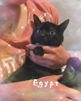 Egypt是一只可爱腼腆的小猫咪。刚来的时候会躲起来不过等适应了环境就会出来。希望你能耐心的等待她。她可以让你抱而且很喜欢别人摸她的头。但她被吓到,她会哈气,不过只会是一瞬间。她可以和别的猫咪相处。最快能赢得她的心就是喂她一根猫条。她的胃口很大而且也很喜欢喝水。她会好好的用猫砂盆,不过最好是用开放式的猫砂盆,因为一開始他需要看到貓砂才知道那是貓砂盆。
