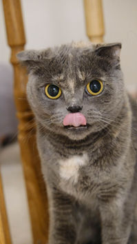 Fishball是一只十分胆小的小猫,但是她不喜欢躲在角落,而是随机选择一块地方石化,像个猫猫玩偶。她像極了一隻小貓頭鷹,眉間的花紋讓她看起來隨時都在皺眉思考。
