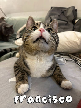 Francisco圆圆的小包子脸和野性的聪明毛有着可爱的反差感!性格也是这样,刚到家就完全不怕新环境和别的猫非常自信的巡视环境。面对别的猫哈他也完全不在意,像个勇敢的小豹子。但遇见人又立马变成粘人撒娇的小猫咪,会在床上找个舒服的位置陪你睡觉。如果你不找他会自己找个地方睡觉,但你去摸摸他也会很配合你和你撒娇。是自信独立但是很爱人类的小猫咪。