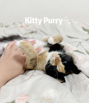Kitty Purry是一只自带蝙蝠侠面具的小猫咪,小小一只,超级害羞,但又非常喜欢贴贴和摸摸。刚到新家时听到声音会躲起来,但一旦安静下来,她立马会主动蹦到你身边躺下,渴望摸摸。一摸就会翻身打呼噜,可享受了。平常最喜欢趴在你身边静静的和你一起学习工作,安安静静的坐一起。偶尔也会和你一起玩逗猫棒。 Kitty Purry不挑食,猫粮和罐头都会吃的津津有味。 她也很喜欢人梳毛,会主动躺地下转着身的给你梳。养她超级省心,安安静静的,完全不拆家。