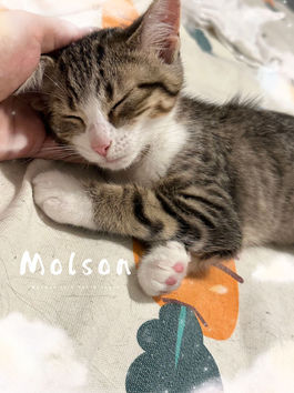 Molson是超黏人的小母猫~有对称的颜值+白手套哦!性格亲人,一碰到你直接开启拖拉机呼噜噜模式,它会直接用头来顶你,无时不刻都想和你贴贴❤️情到深处还会舔+轻啃!撒娇技能满分!超爱玩逗猫棒 小球等各种玩具🪀