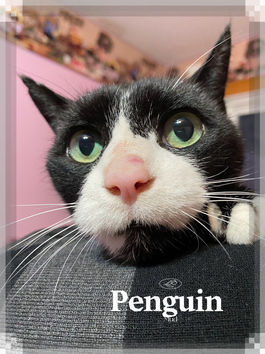 Penguin胆子很小,平常大部分时间躲在封闭式的猫窝里,人不在时才敢去喝水、吃东西,四处活动一下,偶尔会看到她呆在猫树上,需要给她多些时间和空间让她慢慢适应。Penguin可以摸,可以抱,但會需要很長時間以後 ,給他重組時間跟信任才有機會主動。他Penguin不挑食,给什么吃什么。会用猫砂盆。