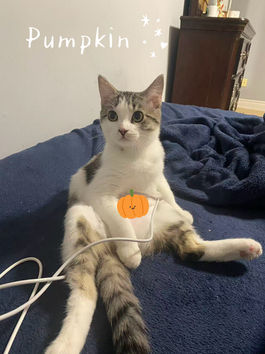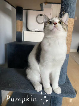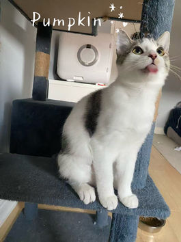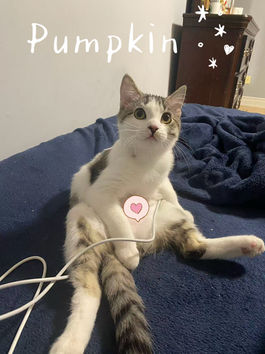 She’s also a chatty girl who responds to you with soft, adorable meows. Pumpkin has excellent litter habits, even in new places, and prefers wet food over dry food.