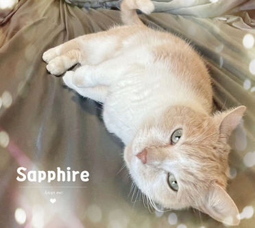Sapphire是一只十分貌美的小猫,蓬松的毛发让她看起来像一块奶油蛋糕,她很爱撒娇,会拿小脑袋顶你的手求摸摸,一摸就顺势躺到你身边,凉凉的粉色肉垫搭着你呼噜呼噜,你脸一凑过去她就十分配合的用头顶蹭蹭,她还喜欢趴在你身上亲亲你,被撸舒服了还要舔舔你。Sapphire的脾气也很好,刚到新环境会有点胆小,喜欢把自己藏在窗帘后面,熟悉了之后就会疯狂撒娇随便撸随便抱,超级喜欢躺在人身上睡觉。她平时也很安静,喜欢趴在高处,但只要你一回家她就会喵喵地凑过来蹭蹭,Sapphire超级爱喝水,也特别爱干净,时不时就要给自己梳洗一番,而且也不排斥人用湿巾给她擦爪子和PP,是一只温顺文静软乎乎的小公主