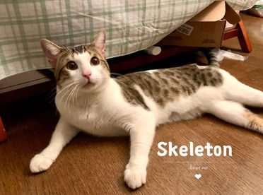 Skeleton is a cat who can stick to people and be cute, and can also be independent and stable. He can quickly adapt to the new environment, and will take the initiative to find people to rub, touch, and let you play with him (even if first meeting). He has a good personality, he will not bully other cats, the one who is always bullied by others. Skeleton is not a picky eater, and is a little expert at eating cans. Skeleton is also very talkative. He will say his love for you out loud, but he will not disturb you when you sleep. Of course, he'll say it out loud when he's hungry, so be sure to get cans ready for him.