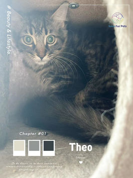 Theo是非常胆小的小猫,一开始会躲躲藏藏,会需要很大的耐心时间,但当他放松下来,会喜欢玩逗猫棒等等的玩具,也会开始与人互动,可以跟其他猫相处,暂时还不会很主动亲人,但抓住他命运的后颈后,可以剪指甲等不太反抗,需要比较长的时间好好的social 。