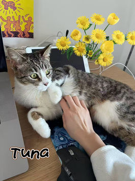 Tuna 是一隻溫柔又可愛的貓咪,內心充滿愛與依賴。剛到新環境時她會比較警覺、稍微害羞一些,但只要給她一點時間與耐心,她會慢慢放鬆,展現出她親人又溫暖的一面。 她其實非常愛玩,總會找機會和你互動玩耍。Tuna 很喜歡被摸摸,也可以被你抱在懷裡。她特別喜歡待在你身邊,常常會坐在你旁邊主動討摸摸,當她放鬆時,還會跳到你的腿上安穩地睡覺,是一隻非常愛撒嬌的小寶貝。 她飲食很好,不挑食,也會乖乖喝水,使用貓砂盆非常熟練。 Tuna 與 Salmon 感情非常深厚,他們會一起玩耍、互相依偎和梳毛,是彼此最重要的陪伴。因此非常建議兩隻一起領養,讓他們繼續互相照顧與依靠。